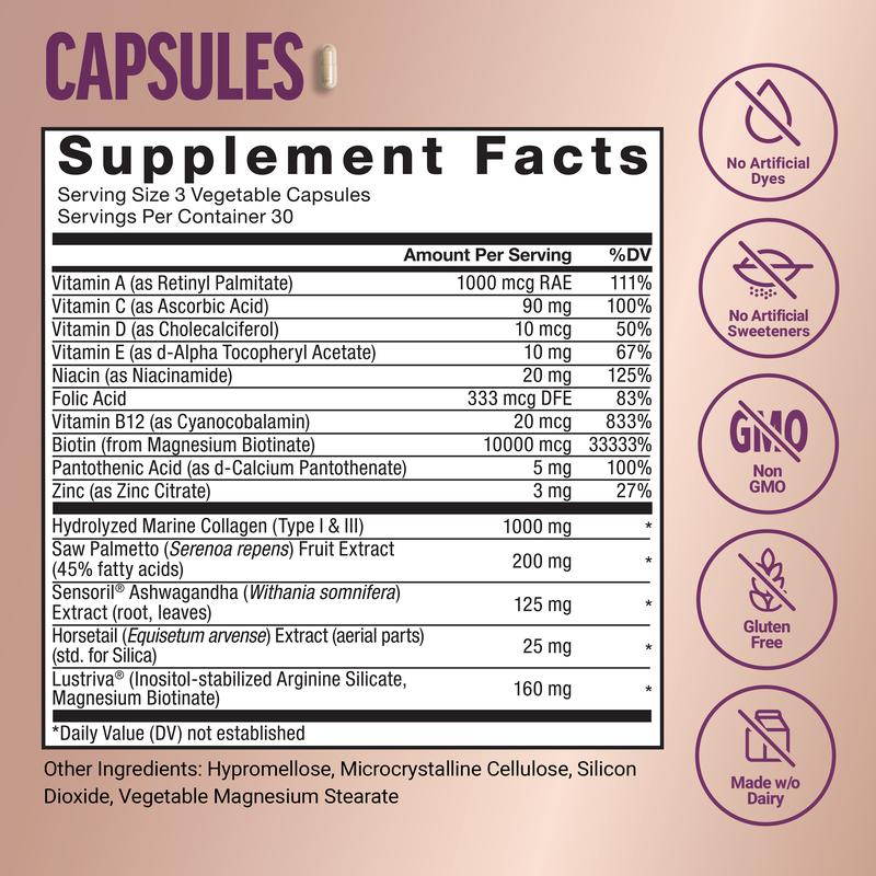 - Lustriva® Complex — Clinically proven biotin-silica blend that accelerates hair growth.